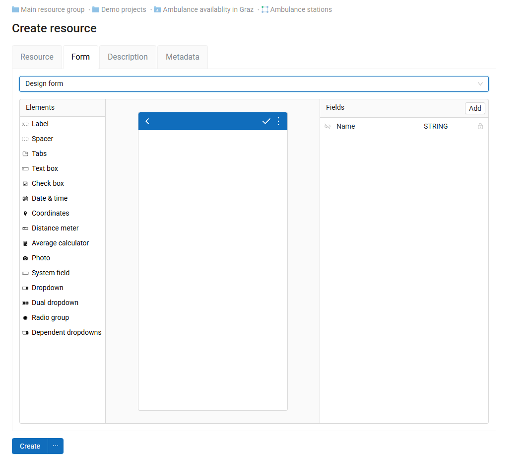 The visual designer is embedded in the Form resource creation interface: