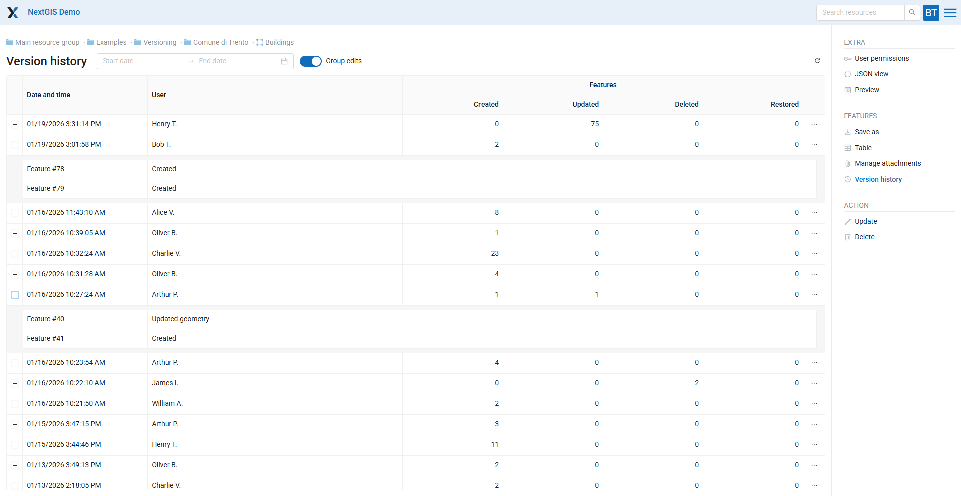 NextGIS Web has built-in vector features version control system. It allows to accumulate information about who, when and how changed the data. Now for all vector layers with enabled Versioning it is possible to open the table with changes history.